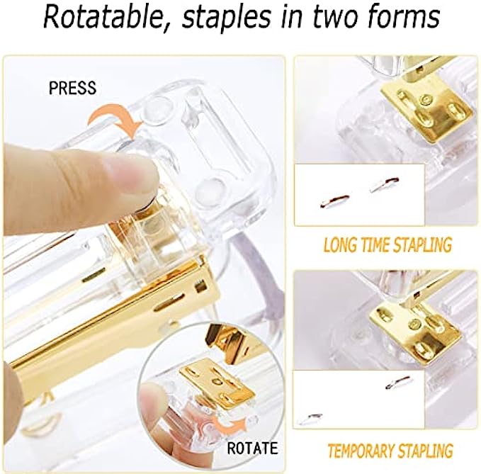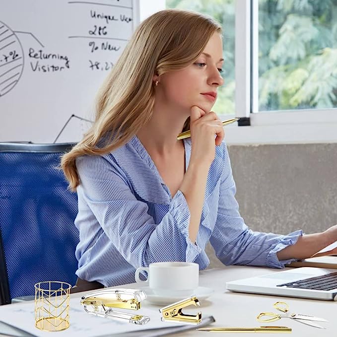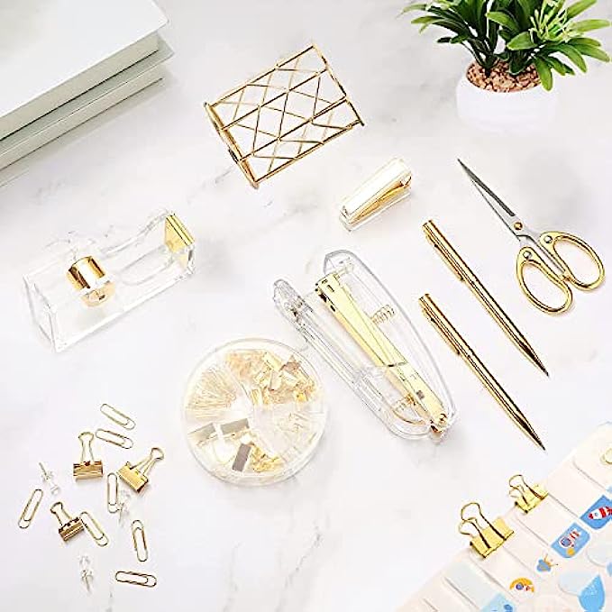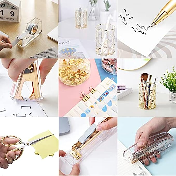 Packing Listing: 1x stapler, 1x staple remover, 1000 x staples, 1 x tape holder, 1 x pen holder, 2 x pens, 1 xscissors and 1 x box of binder clips; This gold office supplies set can meet your needs in daily life and work, keeping your desk or desk drawer organized.